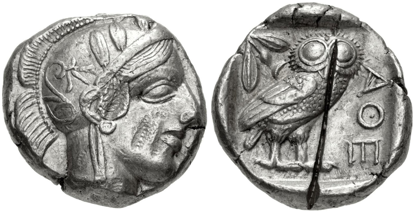 Athens, Attica, Ancient Greece, c. 454-404 BC. Silver Tetradrachm. The front depicts the helmeted head of Athena right, with frontal eye / The back shows an Owl standing right, head facing, closed tail feathers; olive sprig and crescent to left; ΑΘΕ, all all within incuse square.