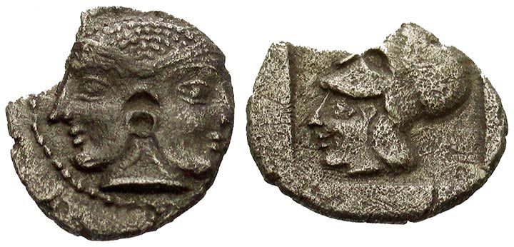 Ancient Greece. Mysia, Lampsacus, c. 390-330 BC. Small silver Obol. The front depicts a Janiform female head, with circular earring / The back shows the helmeted head of Athena facing right.