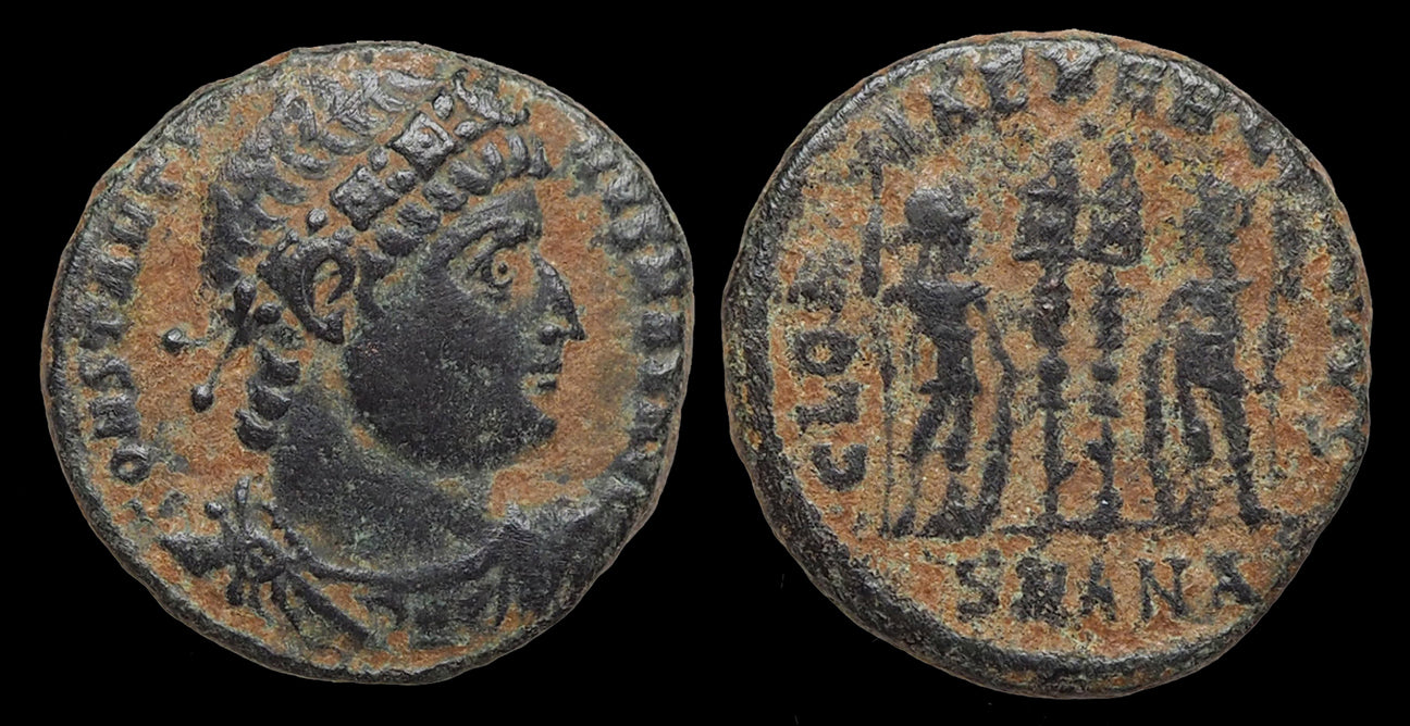 Ancient Rome. Constantine I “The Great”, 307-337 AD. Bronze nummus, struck 324 AD. The front depicts his rosette-diademed, draped, cuirassed bust facing right, inscription CONSTANTINVS MAX AVG / The back shows two soldiers holding spears and shields with one Legionary standard between them, inscription GLORIA EXERCITVS around; Mintmark: SMANA = Antioch mint.