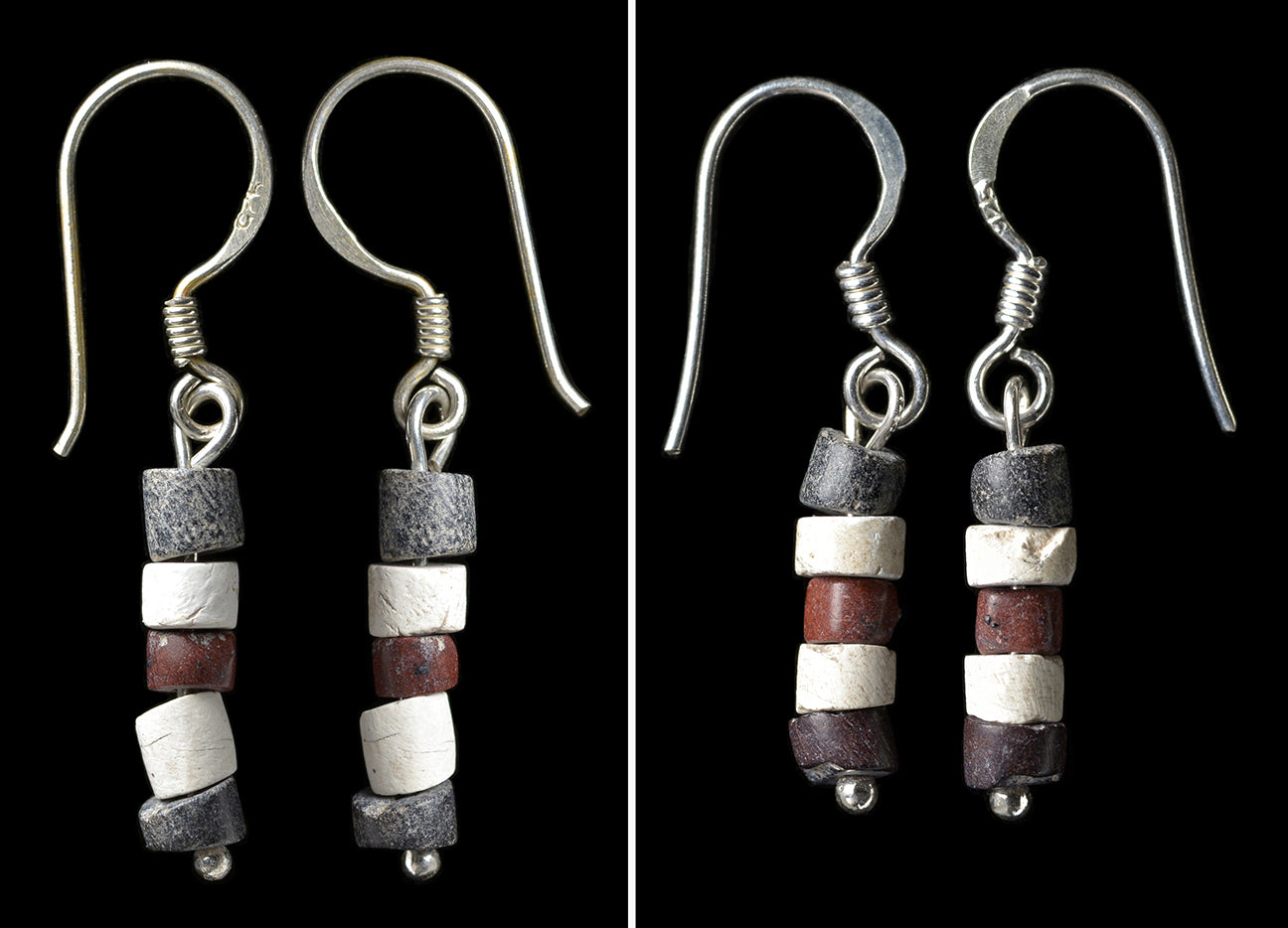 Ancient Sumeria, c. 3000-2000 BC. Beautiful pair of earrings comprised of high quality ancient Sumerian black and red steatite stone with white shell beads. Hung on modern .925 silver earring hooks and findings.