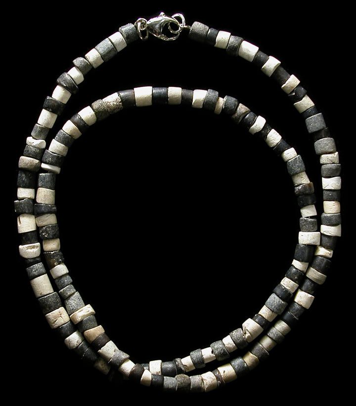 Ancient Sumeria, c. 3000-2000 BC. Marvelous necklace comprised of high quality ancient Sumerian beads. Beautiful black stone and white shell beads, re-strung on sturdy wire with silver clasp and findings. Measures 19" long.